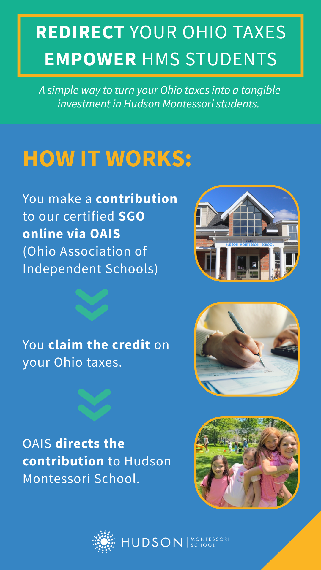 What if a portion of your Ohio taxes could directly support Hudson Montessori School students? Through our Scholarship Granting Organization program — or SGO — they can! Redirect your Ohio taxes and empower HMS students. It’s a simple way to make a significant impact on our community.